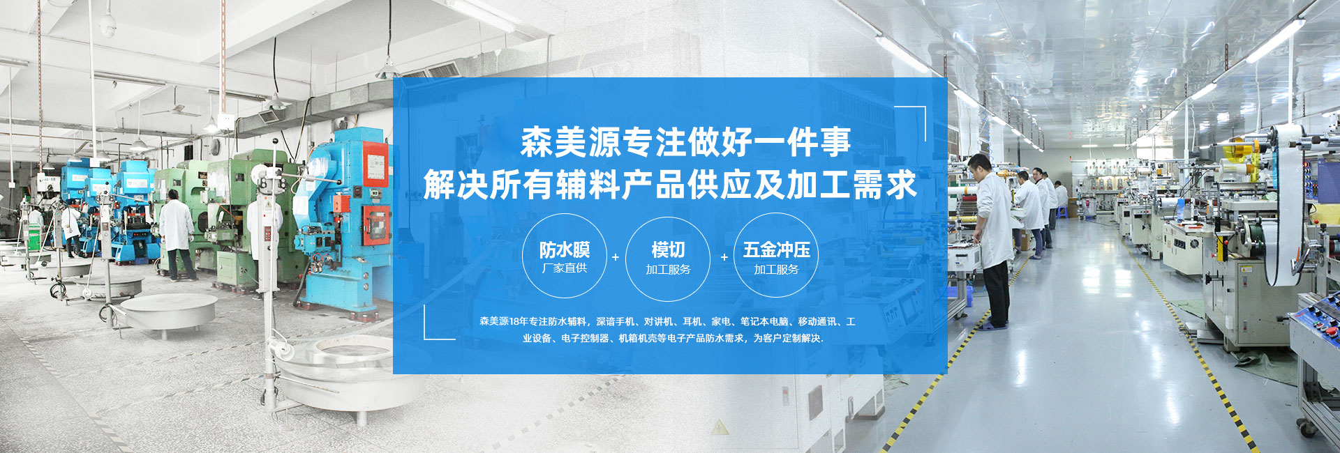 森美源位于深圳寶安大浪路鴻源工業園,占地面積5400平米,工廠擁有日本,臺灣進口和國產模切機25臺及4條成熟模切組合QDC線。工廠主要用于研發生產:電子通訊防水膜,保護膜(喇叭防水膜,咪頭防水膜聽筒防水膜,手機防水膜各防水雙面膠)以及電子通訊的防塵防震產品